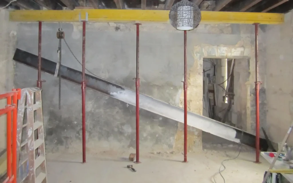 Des étais métalliques et des poutres de soutien sont installés afin de reprendre les charges du plafond ou de l’étage supérieur pendant les travaux.